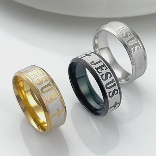 The Jesus Cross Ring embodies faith, devotion, and timeless strength — crafted from durable stainless steel with a gold-polished interior that reflects both light and belief. Each engraved “JESUS” and cross stands as a reminder of what anchors you through life’s storms.